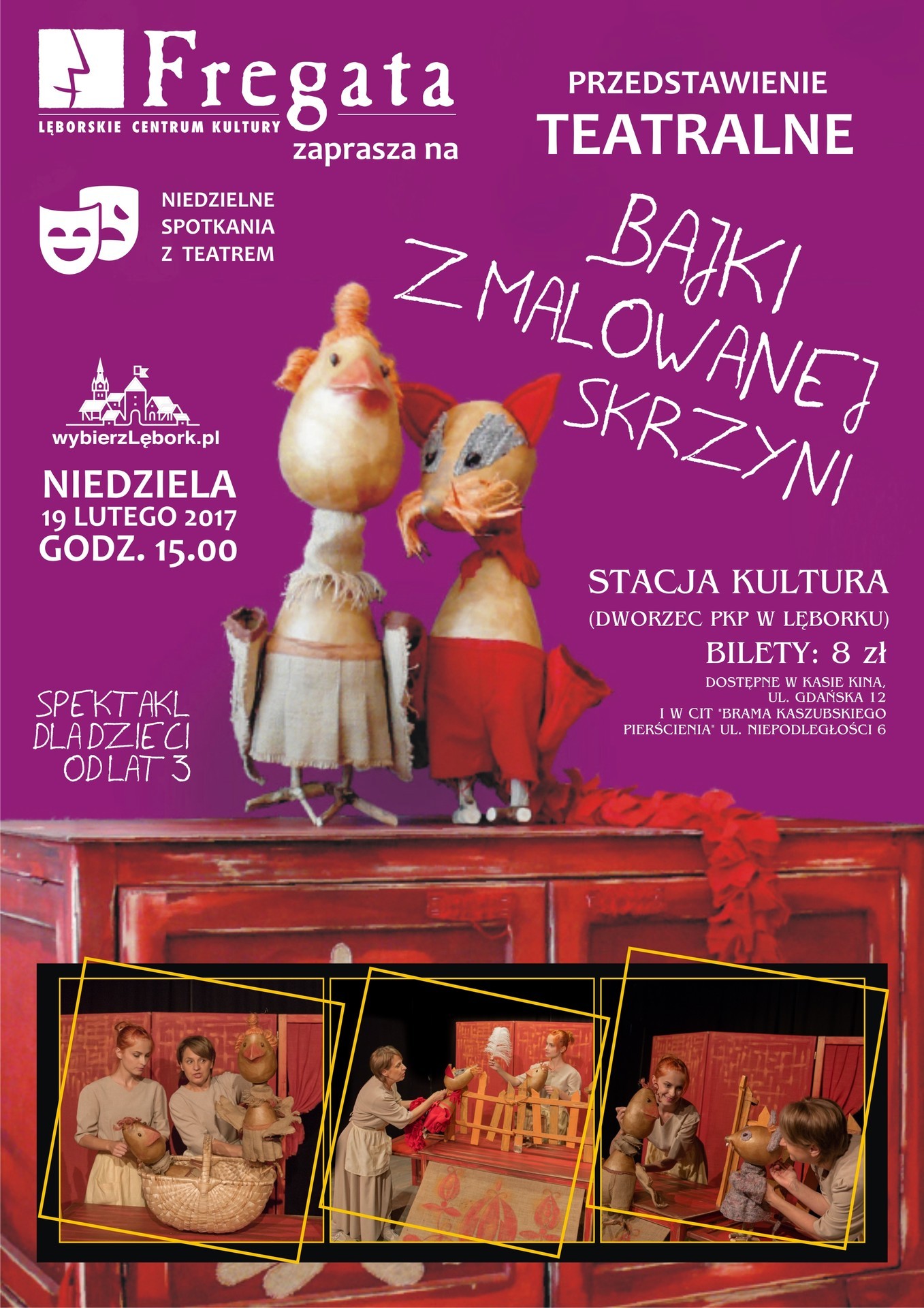 Lęborskie Centrum Kultury „Fregata” zaprasza na kolejne przedstawienie z cyklu „Niedzielne spotkania z teatrem”. 19 lutego 2017 roku. Teatr „Władca Lalek” zaprezentuje w Stacji Kultura (dworzec PKP, ul. Dworcowa 8) przedstawienie pod tytułem „Bajki z malowanej skrzyni”. Początek o godzinie 15:00. Bilety w cenie 8 złotych dostępne są w Kasie Kina przy ulicy Gdańskiej oraz w CIT przy alei Niepodległości 6. Liczba biletów jest ograniczona.