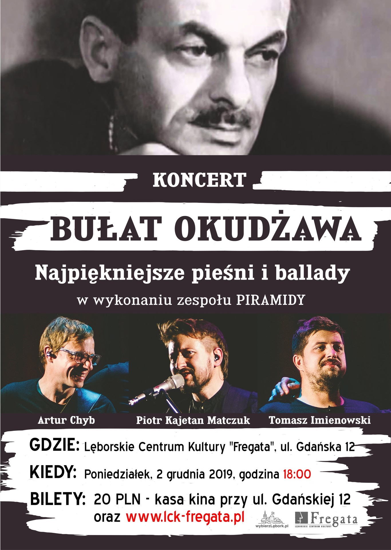 Lęborskie Centrum Kultury „Fregata” zaprasza na koncert „Bułat Okudżawa - najpiękniejsze pieśni i ballady” w wykonaniu zespołu Piramidy. To wyjątkowe wydarzenie muzyczne odbędzie się 2 grudnia 2019 roku w Sali Kina „Fregata” w Lęborku przy ulicy Gdańskiej 12. Początek o godzinie 18:00. Bilety w cenie 20 złotych dostępne są w kasie kina „Fregata” oraz za pośrednictwem strony www.lck-fregata.pl