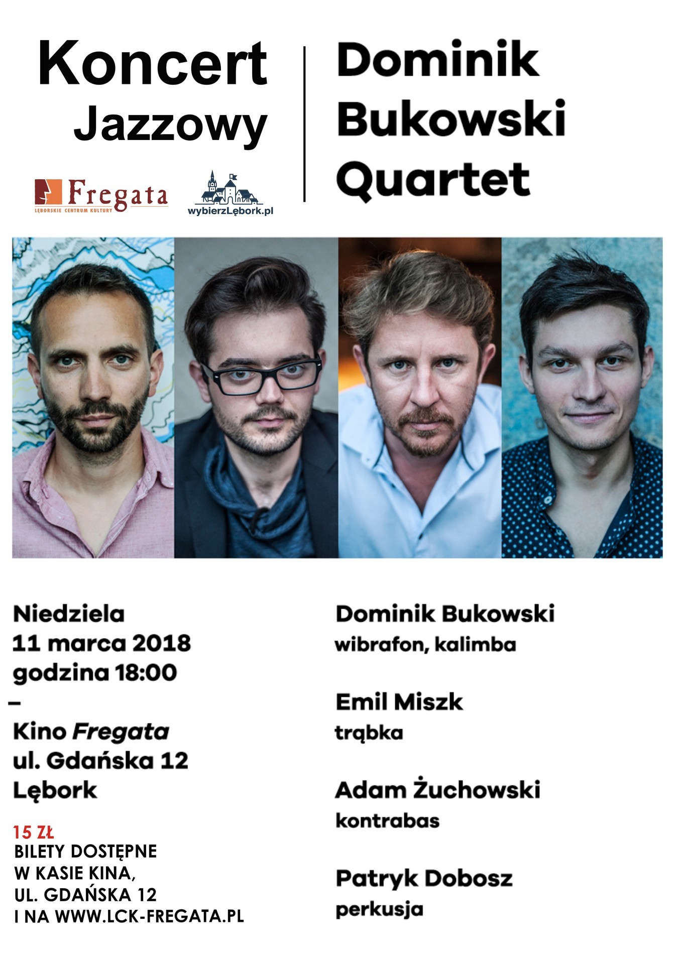 Lęborskie Centrum Kultury „Fregata” zaprasza na koncert jazzowy w wykonaniu grupy „Dominik Bukowski Quartet”. To wydarzenie muzyczne odbędzie się w niedzielę, 11 marca 2018 roku, w Kinie „Fregata” przy ulicy Gdańskiej 12 w Lęborku. Początek o godzinie 18:00.