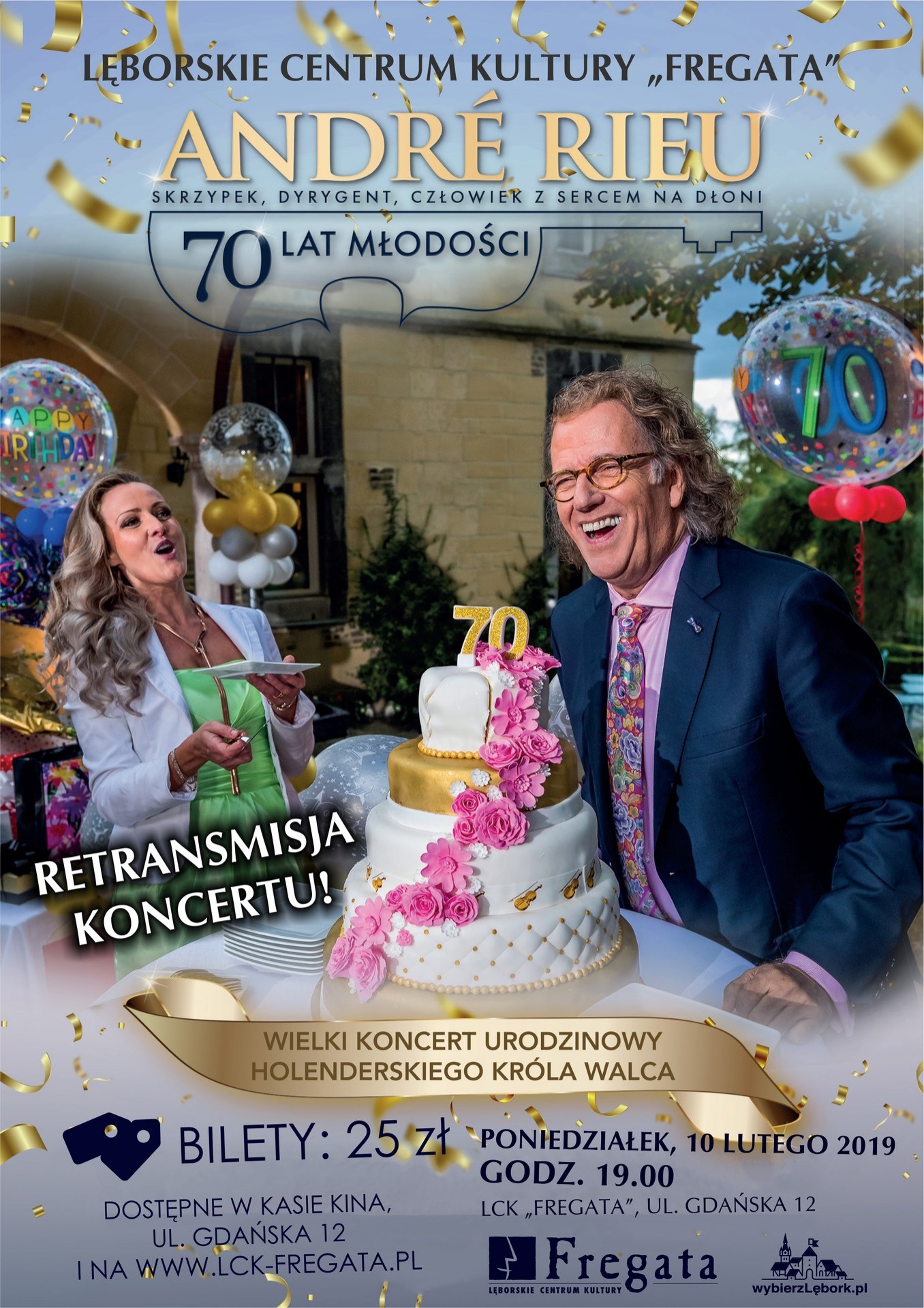 Lęborskie Centrum Kultury „Fregata” zaprasza na retransmisję koncertu „André Rieu, czyli 70 lat młodości”. Zapis tego wspaniałego wydarzenie muzycznego zobaczymy na ekranie kina „Fregata” w poniedziałek, 10 lutego 2020 roku. Początek o godzinie 19:00. Bilety w cenie 25 złotych dostępne są w kasie kina oraz za pośrednictwem strony www.lck-fregata.pl