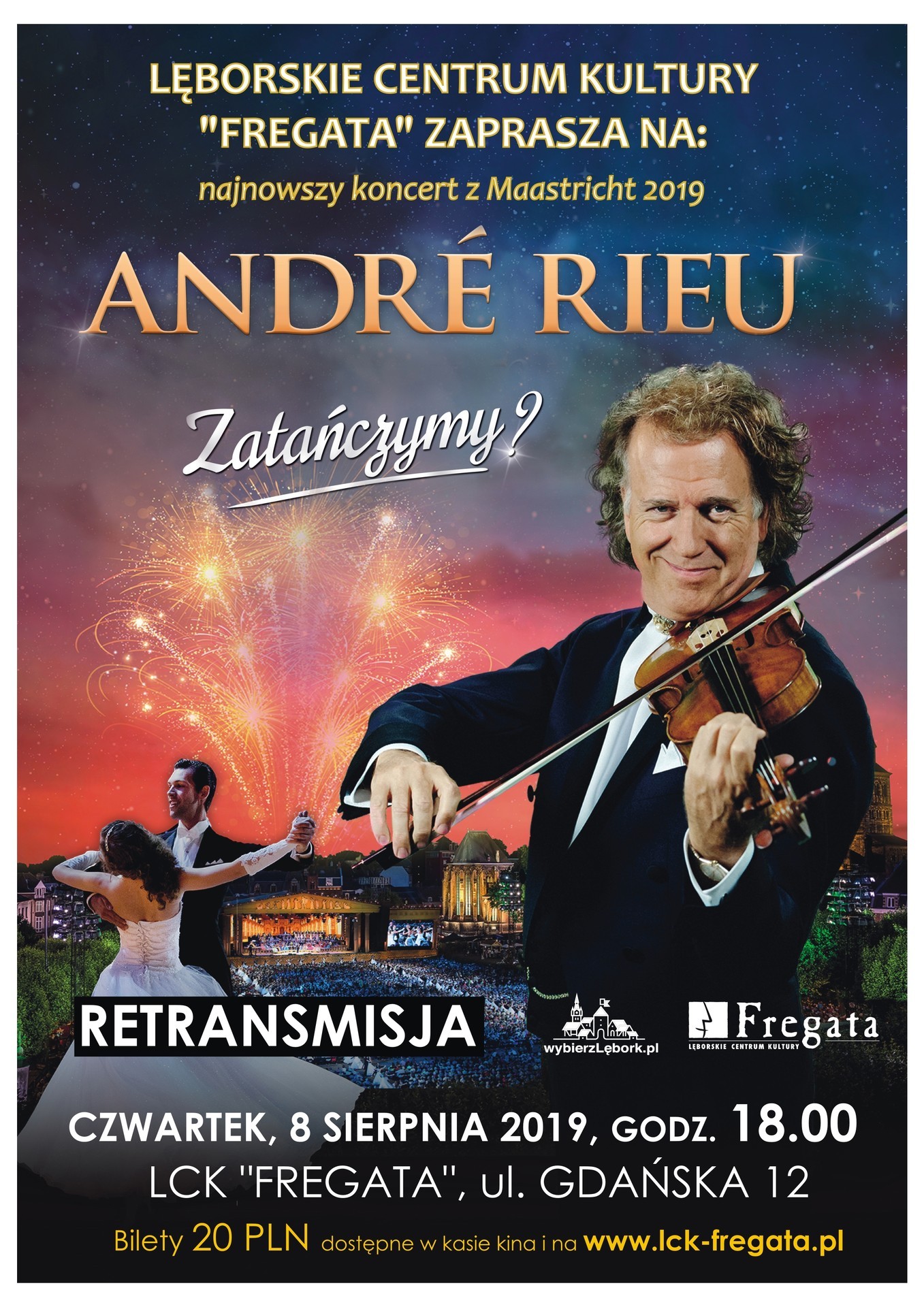 Lęborskie Centrum Kultury „Fregata” zaprasza na retransmisję koncertu Andre Rieu. Ten wyjątkowy koncert zobaczymy na ekranie kina „Fregata” w czwartek, 8 sierpnia 2019 roku. Początek o godzinie 18:00. Bilety w cenie 20 złotych dostępne są w kasie kina oraz za pośrednictwem strony www.lck-fregata.pl