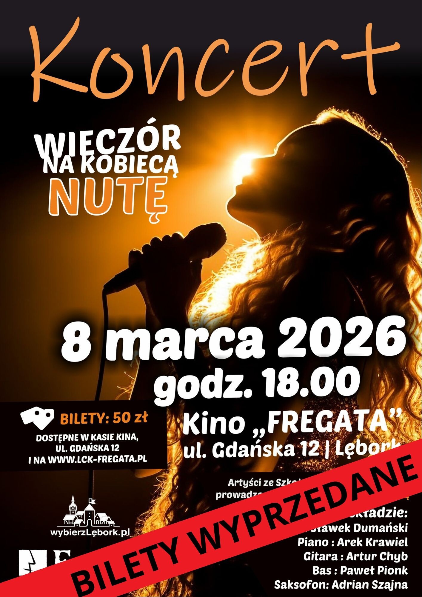 Lęborskie Centrum Kultury "Fregata" zaprasza na koncert pod tytułem "Wieczór na kobiecą nutę". Wydarzenie odbędzie się w niedzielę, 8 marca 2026 roku, w Kinie “Fregata”.