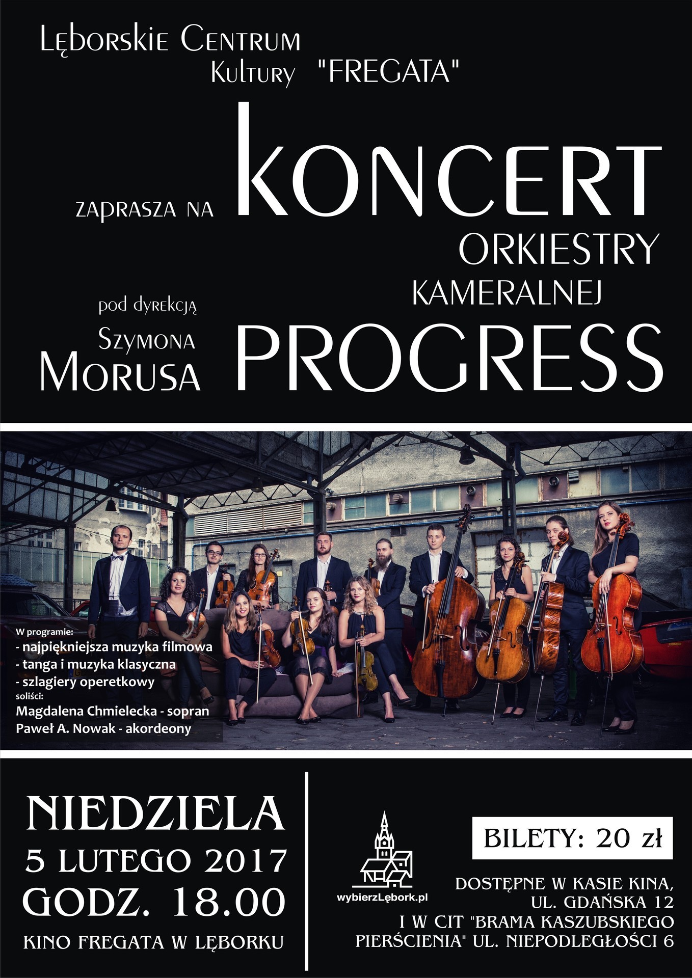 Lęborskie Centrum Kultury „Fregata” zaprasza na wyjątkowy koncert w wykonaniu Orkiestry Kameralnej PROGRESS pod dyrekcją Szymona Morusa. W niedzielę, 5 lutego 2017 roku, na scenie w Kinie „Fregata” będzie można usłyszeć najpiękniejsze tematy muzyki filmowej i klasycznej oraz szlagiery operetkowe. Początek koncertu o godzinie 18:00.