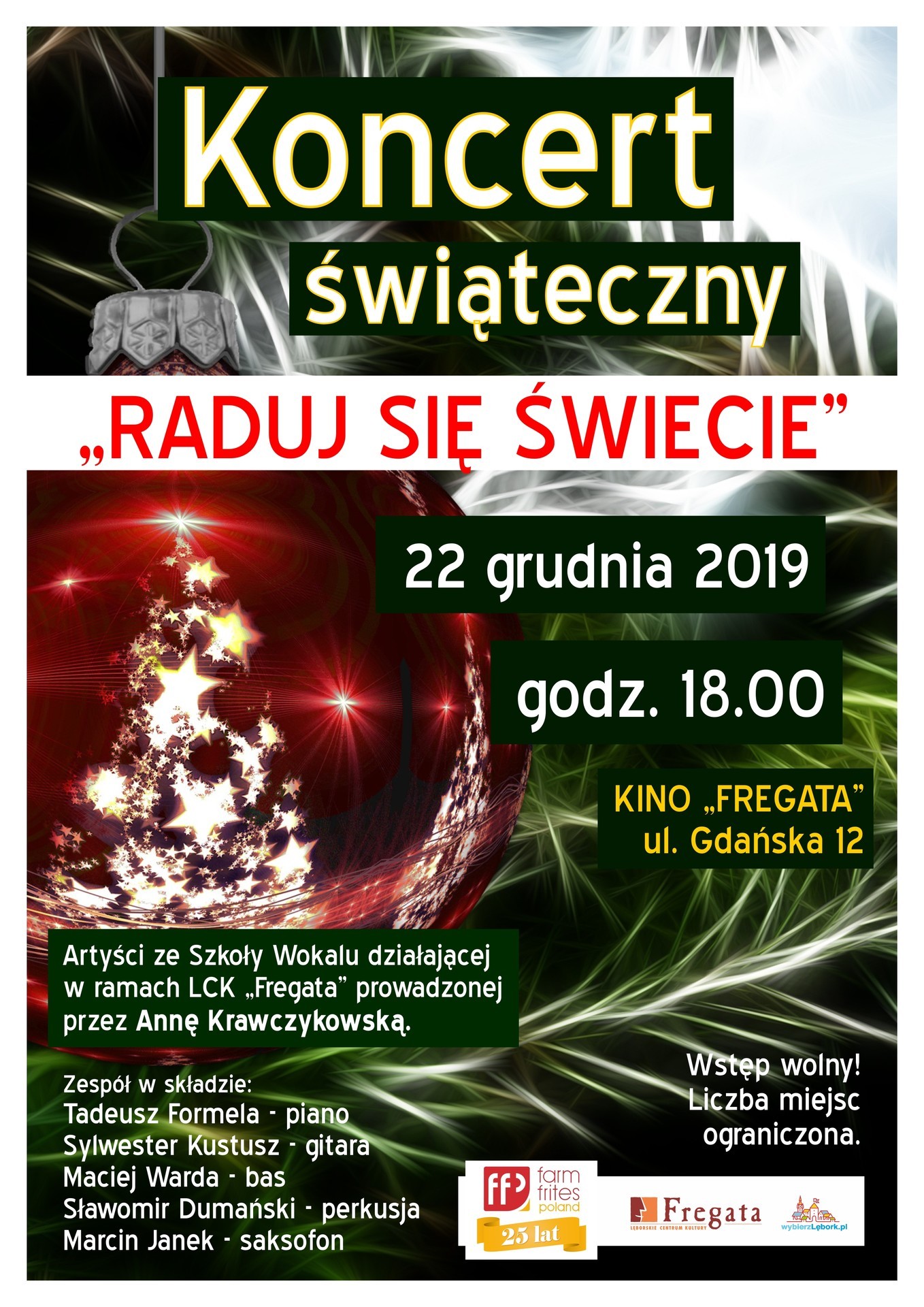 Lęborskie Centrum Kultury „Fregata” zaprasza w niedzielę 22 grudnia 2019 roku do Kina „Fregata” na koncert świąteczny pod tytułem „Raduj się świecie”. Początek o godzinie 18:00.
