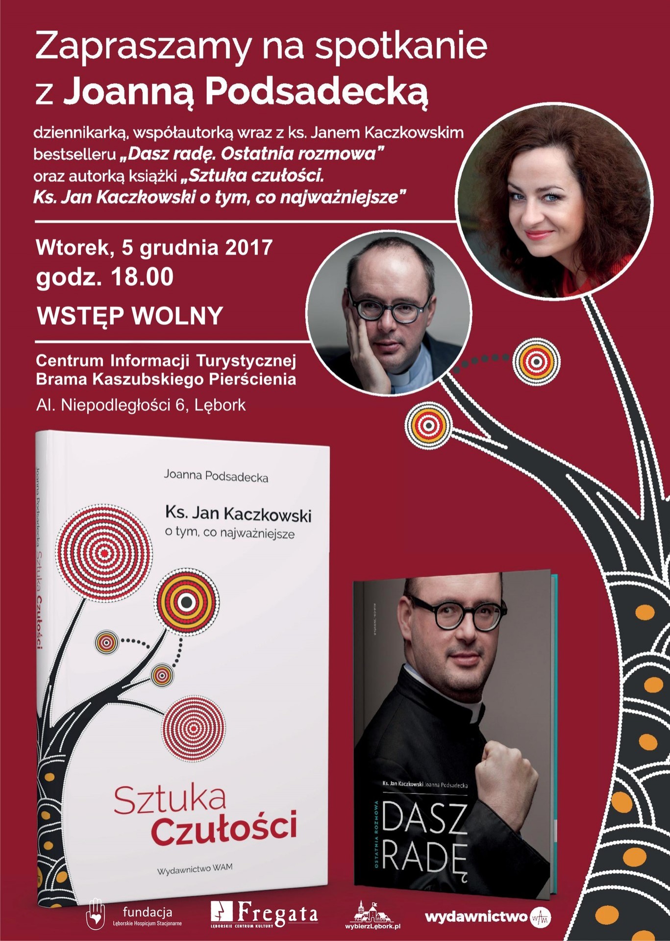 We wtorek, 5 grudnia 2017 roku, zapraszamy do Centrum Informacji Turystycznej przy alei Niepodległości w Lęborku, na spotkanie poświęcone księdzu Janowi Kaczkowskiemu. Gościem będzie Joanna Podsadecka. Dziennikarka jest współautorką wraz z księdzem Janem bestsellera "Dasz radę. Ostatnia rozmowa". Początek o godzinie 18. Organizatorami tego wydarzenia są: Wydawnictwo WAM, Lęborskie Centrum Kultury „Fregata” oraz Fundacja Lęborskie Hospicjum Stacjonarne. W trakcie spotkania będzie można nabyć książki autorki, w tym ostatnio wydaną pod tytułem "Sztuka czułości. Ks. Jan Kaczkowski o tym, co najważniejsze". Całość poprowadzi Włodzimierz Raszkiewicz z Radia Gdańsk. Zapraszamy serdecznie.
