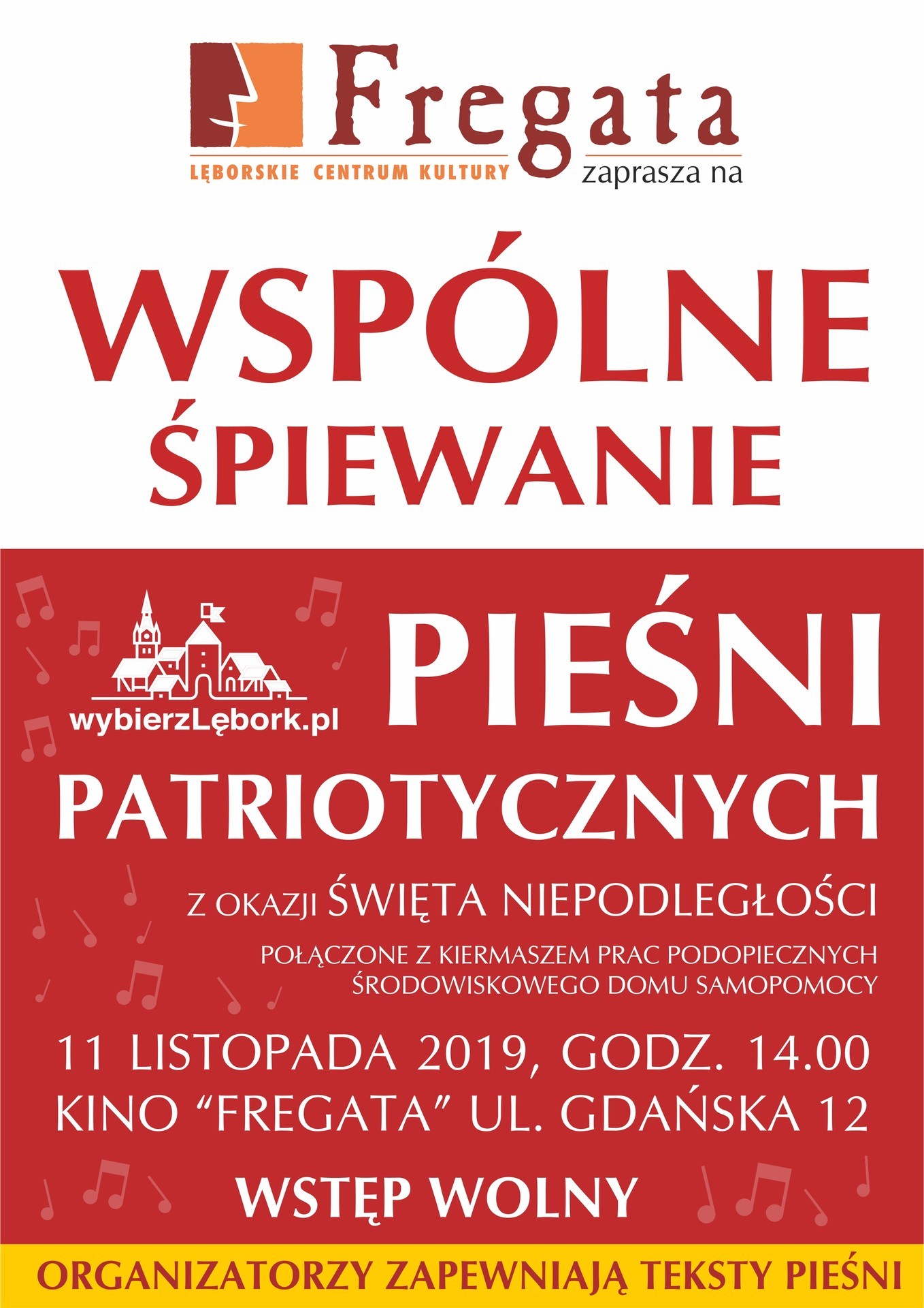 Lęborskie Centrum Kultury „Fregata” zaprasza na dziesiąte lęborskie Wspólne Śpiewanie Pieśni Patriotycznych z okazji Święta Niepodległości. Impreza jest jedną z nielicznych okazji do wspólnego przypomnienia sobie starych polskich piosenek i pieśni patriotycznych.
