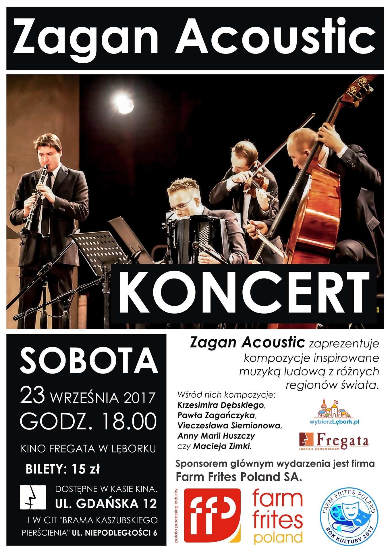 Lęborskie Centrum Kultury „Fregata” zaprasza na koncert kwartetu „Zagan Acoustic”. To wyjątkowe wydarzenie muzyczne odbędzie się w sobotę, 23 września w sali kinowej przy ulicy Gdańskiej 12 w Lęborku. Początek o godzinie 18:00. Koncert jest częścią Roku Kultury w firmie Farm Frites Poland SA.