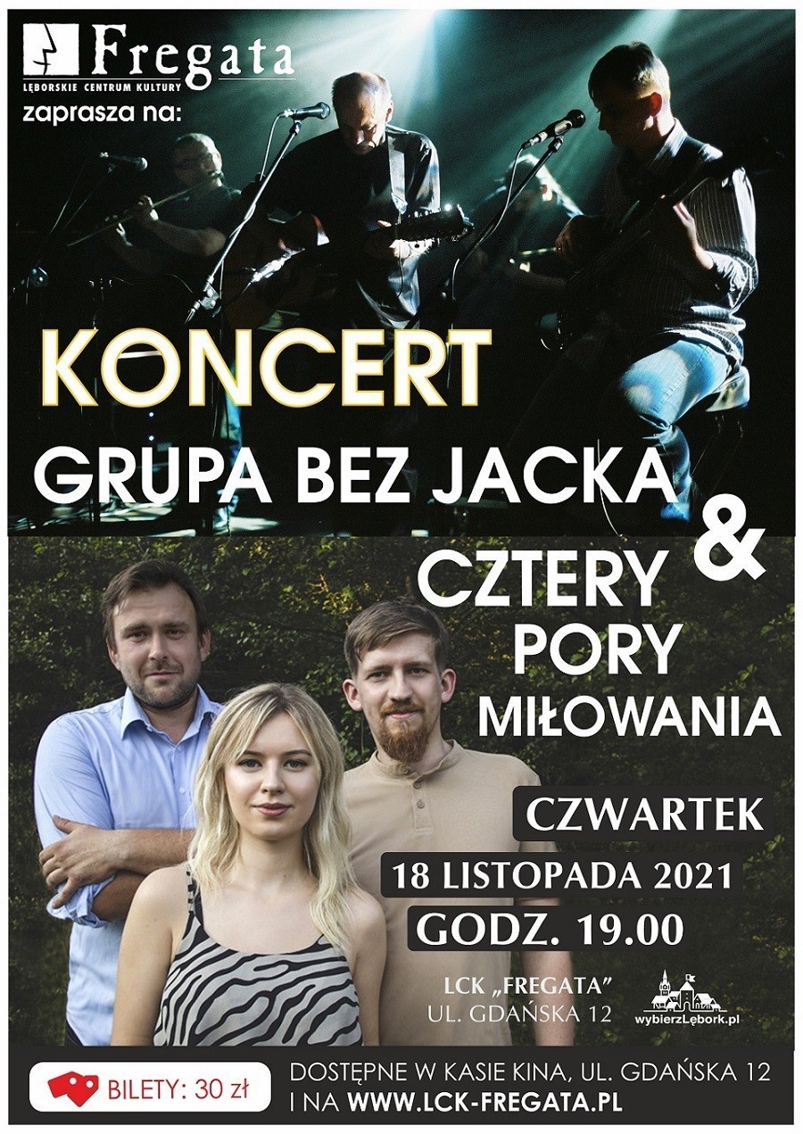 Lęborskie Centrum Kultury „Fregata” zaprasza na koncert dwóch zespołów z nurtu poezji śpiewanej. W czwartek, 18 listopada 2021 roku, na scenie lęborskiej „Fregaty” spotkają się: Grupa Bez Jacka i Cztery Pory Miłowania. Początek o godzinie 19:00