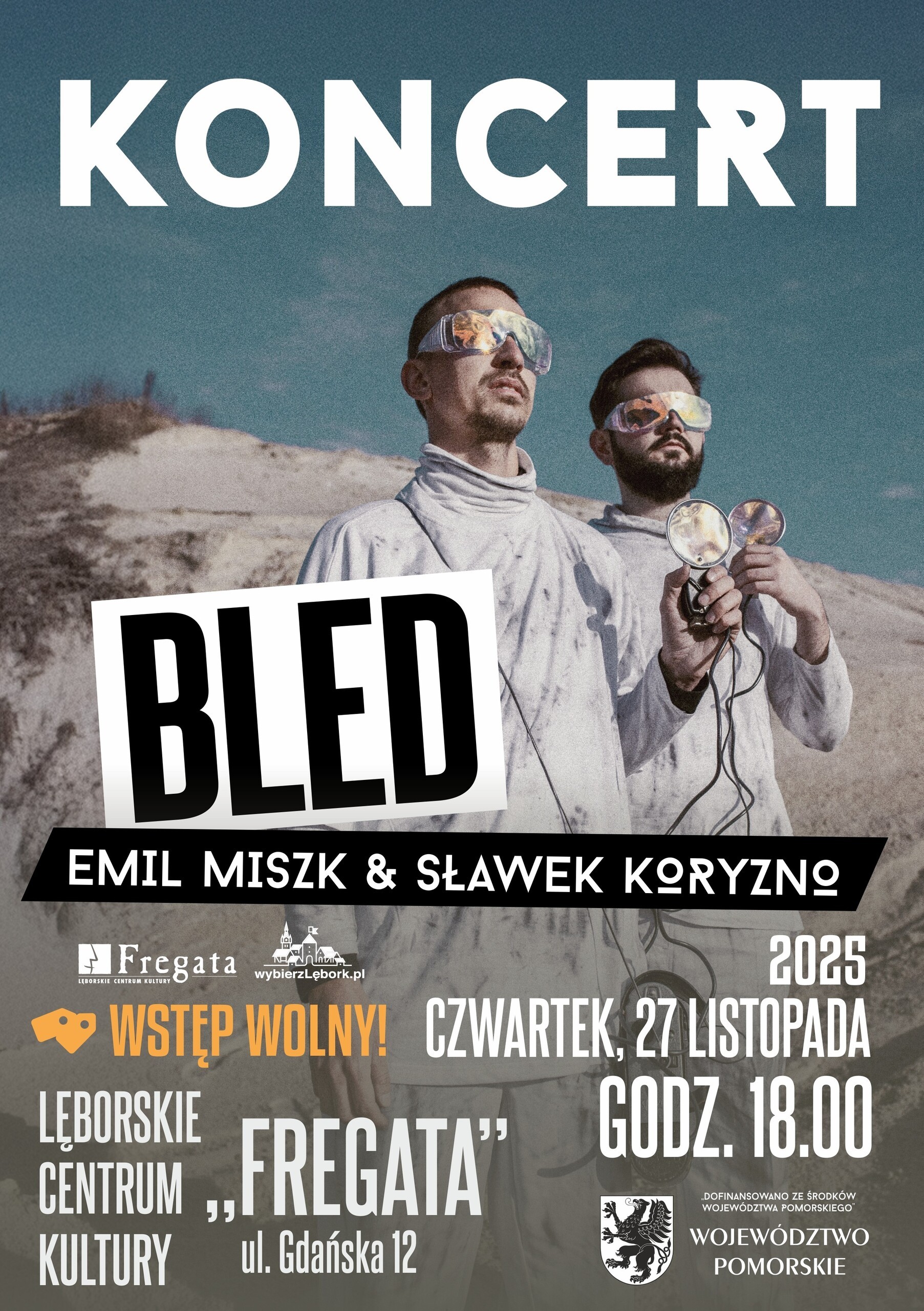 Lęborskie Centrum Kultury "Fregata" zaprasza na koncert zespołu BLED - duetu, który współtworzą perkusista Sławek Koryzno oraz Emil Miszk, pochodzący z Lęborka trębacz, laureat Fryderyka w kategorii „Debiut Roku - Jazz”. Artyści wystąpią w czwartek, 27 listopada 2025 roku, w Kinie "Fregata" przy ulicy Gdańskiej 12 w Lęborku.